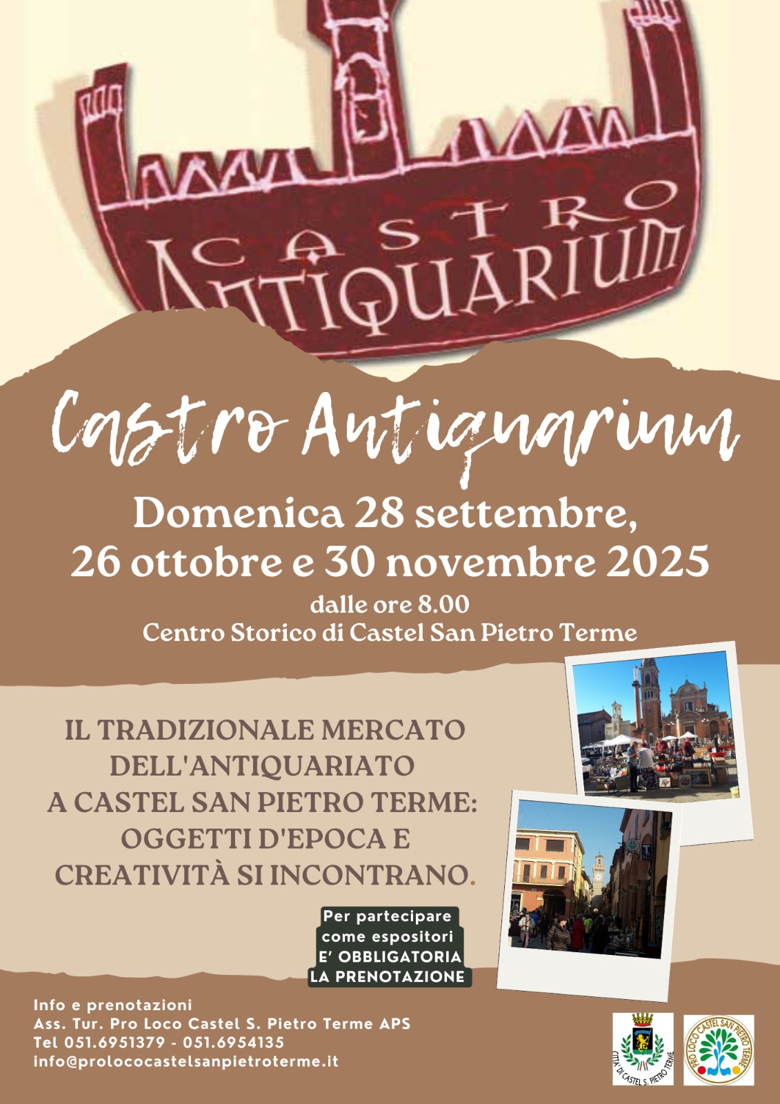 Un’occasione ideale per trascorrere una piacevole domenica adatta a tutta la famiglia nell’accogliente centro storico di Castel San Pietro Terme, fra le bancarelle di oggettistica, ceramica, libri, stoffe, francobolli, mobili, arredi e molto altro ancora, che sono presenti dalle 8 alle 20, mentre possono rimanere aperti anche i locali e i negozi.