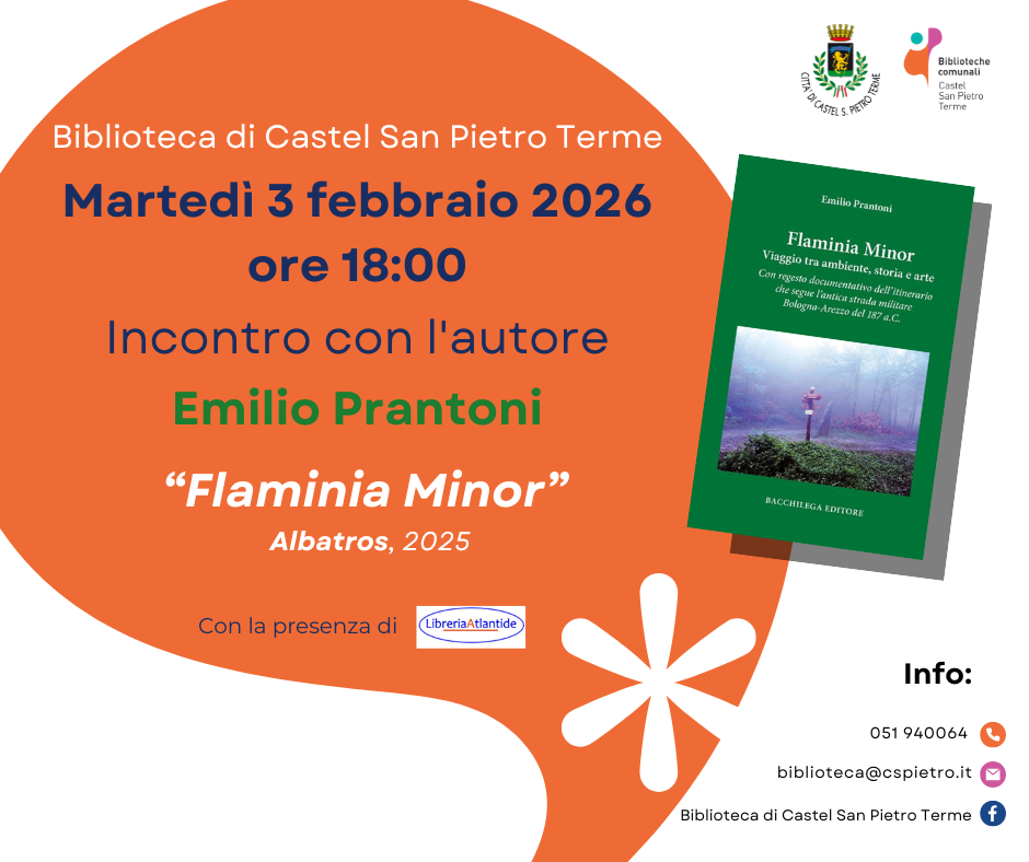 La rassegna prosegue martedì 3 febbraio 2026 con Emilio Prantoni, che presenterà il libro “Flaminia Minor” (Bacchilega Editore, 2025), in un incontro dedicato alla scoperta del romanzo e al dialogo con i lettori.