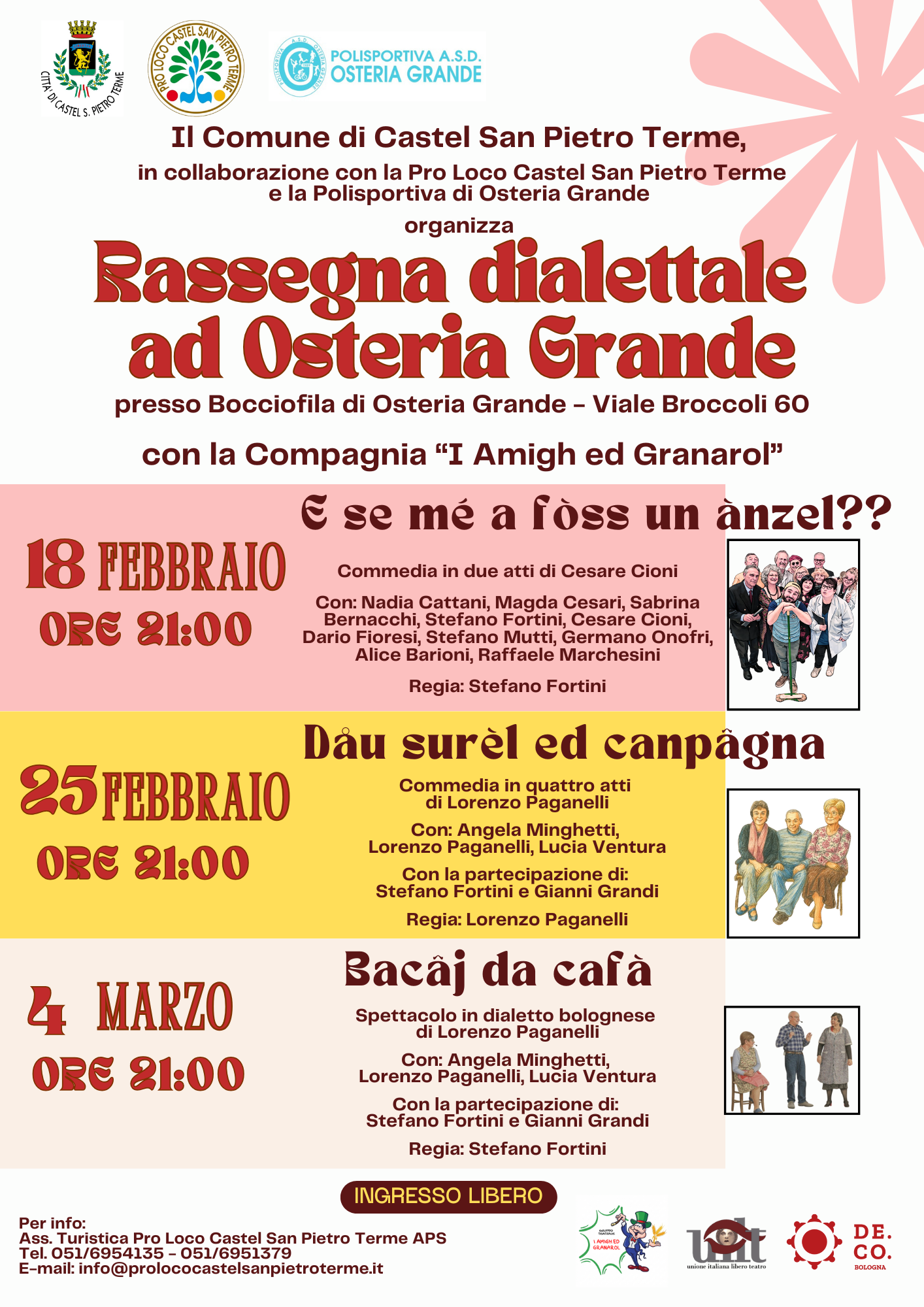 Il Comune di Castel San Pietro Terme, nell’ambito delle azioni di valorizzazione delle tradizioni culturali e della memoria collettiva, promuove la Rassegna Dialettale di Osteria Grande, realizzata in coprogettazione con la Pro Loco Castel San Pietro Terme e la Polisportiva di Osteria Grande.