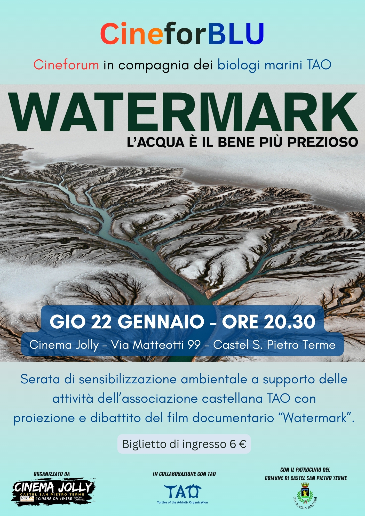 L’iniziativa, inserita nel progetto CineForBLU, è realizzata in collaborazione con l’associazione TAO – Turtles of the Adriatic Organization e con il patrocinio del Comune di Castel San Pietro Terme.