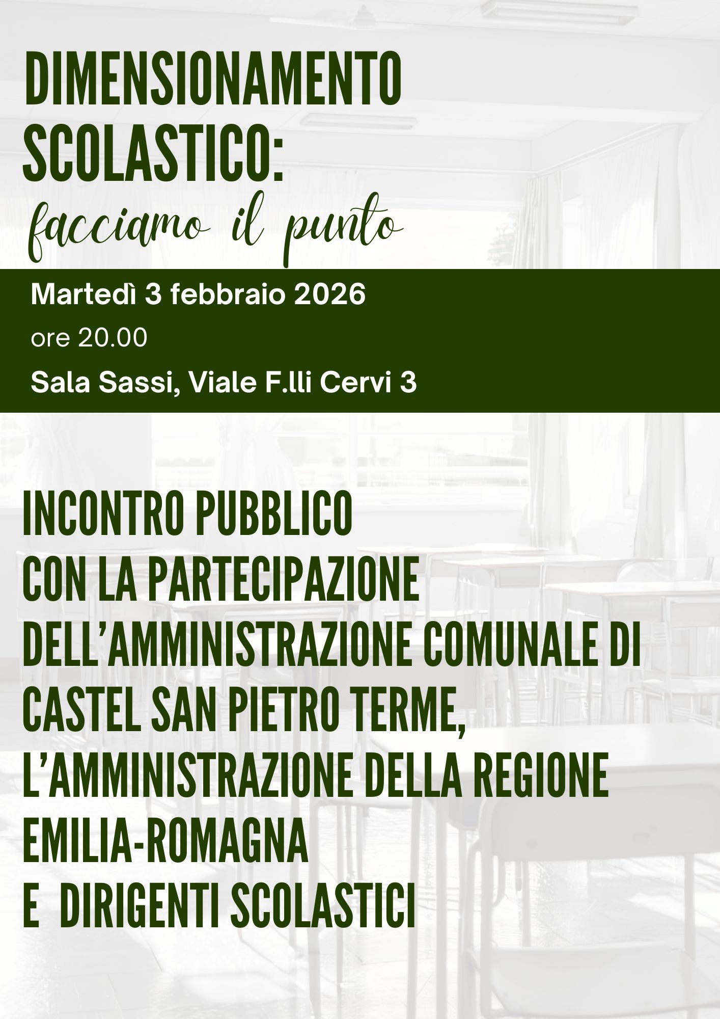 Martedì 3 febbraio 2026 alle ore 20.00, presso la Sala Sassi di viale Fratelli Cervi 3, si terrà un incontro pubblico di approfondimento e confronto sul tema del dimensionamento scolastico, dal titolo “Dimensionamento scolastico: facciamo il punto”.