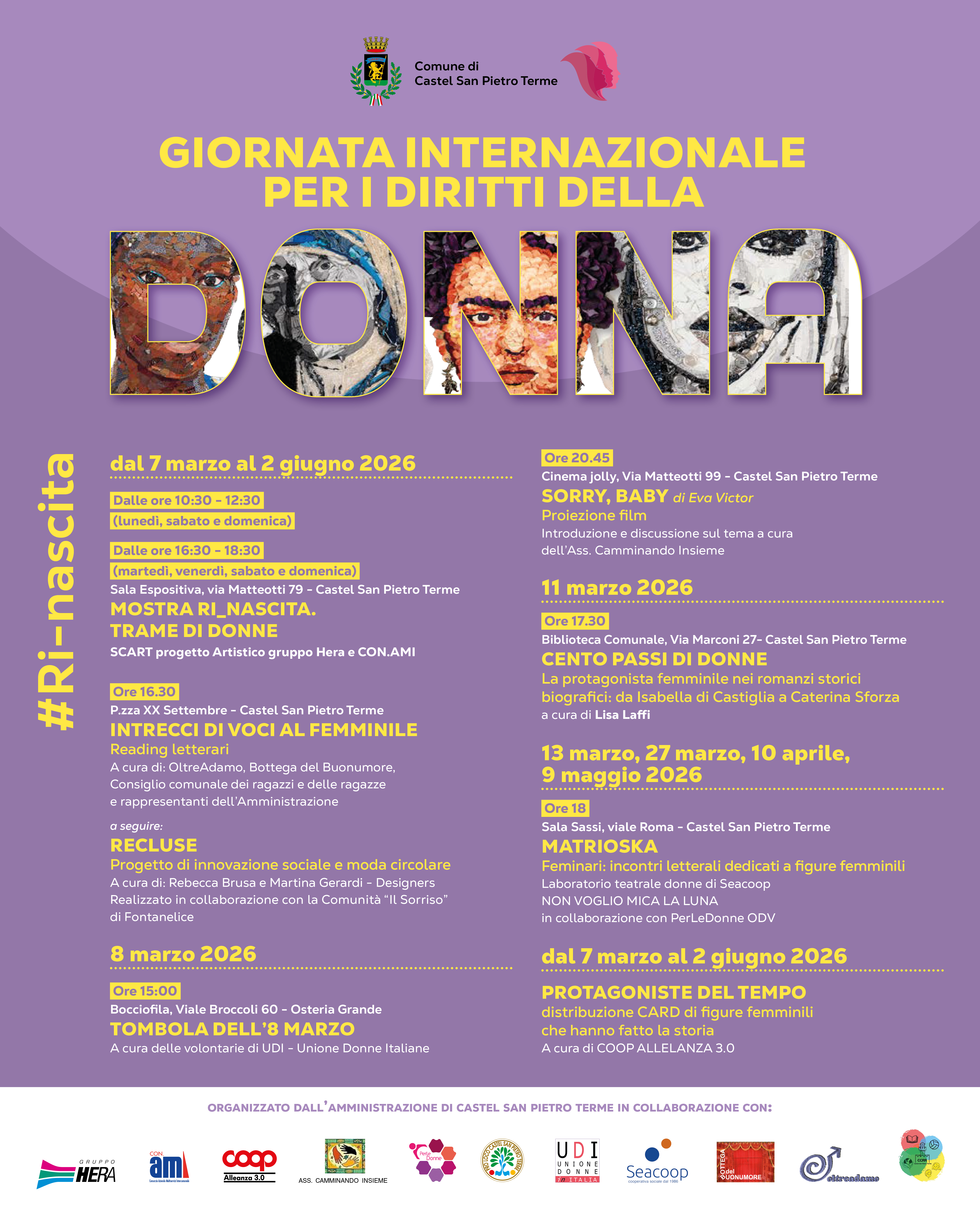Il programma prende avvio sabato 7 marzo 2026 con l’inaugurazione della mostra “RI_NASCITA. Trame di Donne”, realizzata nell’ambito del progetto artistico SCART del Gruppo Hera in collaborazione con CON.AMI. L’esposizione, allestita presso la Sala Espositiva di via Matteotti 79, sarà visitabile dal 7 marzo al 2 giugno 2026 e propone un percorso artistico dedicato ai temi della rinascita e della rigenerazione, raccontando attraverso materiali di recupero e linguaggi espressivi contemporanei un femminile capace di reinventarsi, intrecciare relazioni e costruire nuovi significati a partire dallo scarto.
