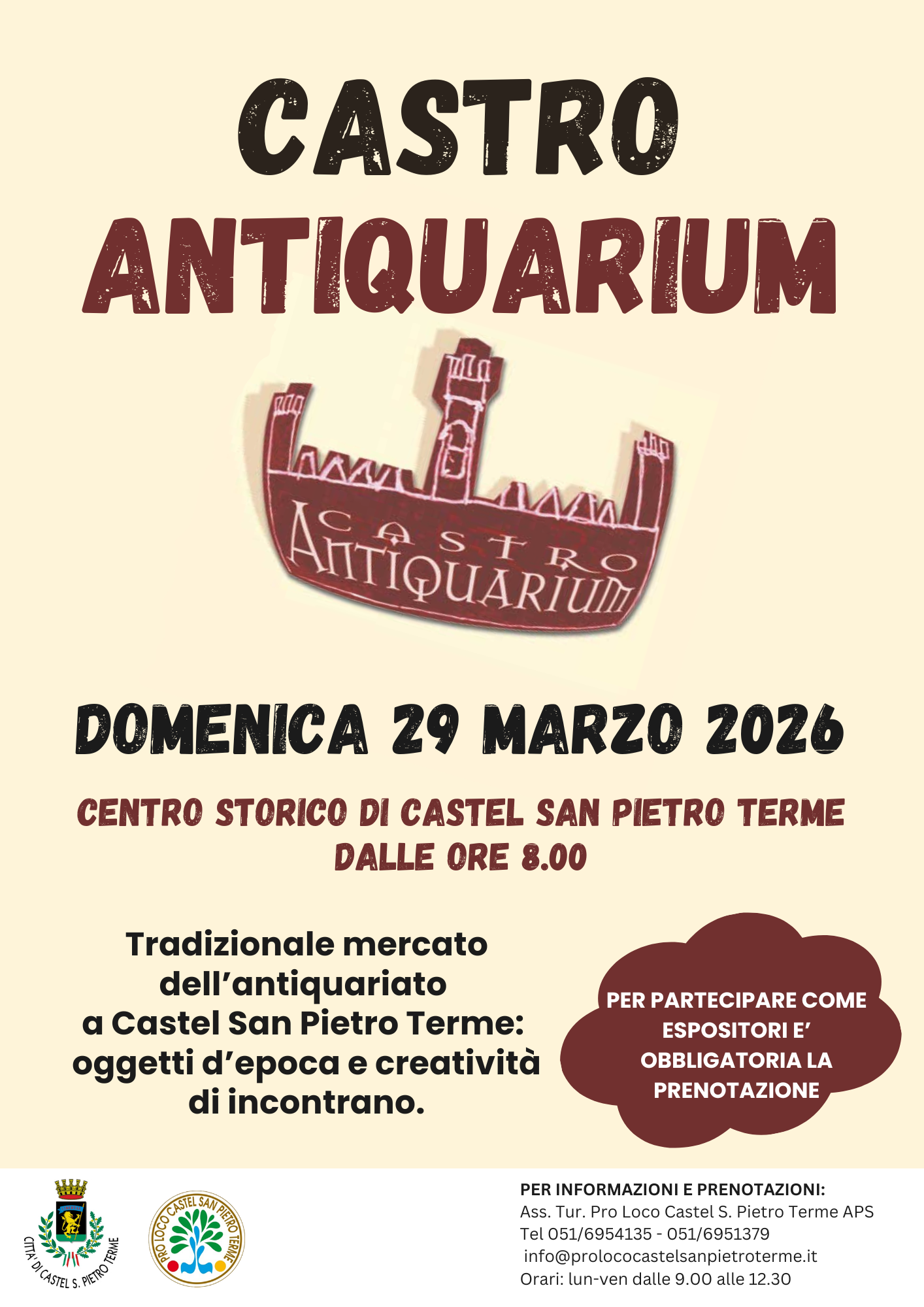 Il mercato dell'antiquariato di Castel San Pietro Terme si svolgerà domenica 29 marzo nel centro storico del paese dalle ore 8:00, offrendo bancarelle con oggetti d'epoca, libri, stoffe, arredi e tanto altro!Il mercato è organizzato dall’Associazione turistica Pro Loco con il patrocinio dell’Amministrazione Comunale, e rappresenta un'ottima occasione da trascorrere in compagnia immergendosi nel centro storico del nostro paese in queste prime giornate primaverili.Per partecipare come espositori è obbligatoria la prenotazione a Pro Loco.Per informazioni: Associazione Turistica Pro Loco - via Ugo Bassi 19 - tel. 051 6951379 – e-mail: info@prolococastelsanpietroterme.it - sito www.prolococastelsanpietroterme.it e pagina Facebook https://www.facebook.com/people/Associazione-Turistica-Pro-Loco-Castel-San-Pietro-Terme-APS/ Per informazioni e aggiornamenti sulle iniziative organizzate o patrocinate dal Comune di Castel San Pietro Terme:sito www.cspietro.it e pagina Facebook www.facebook.com/cspietro/