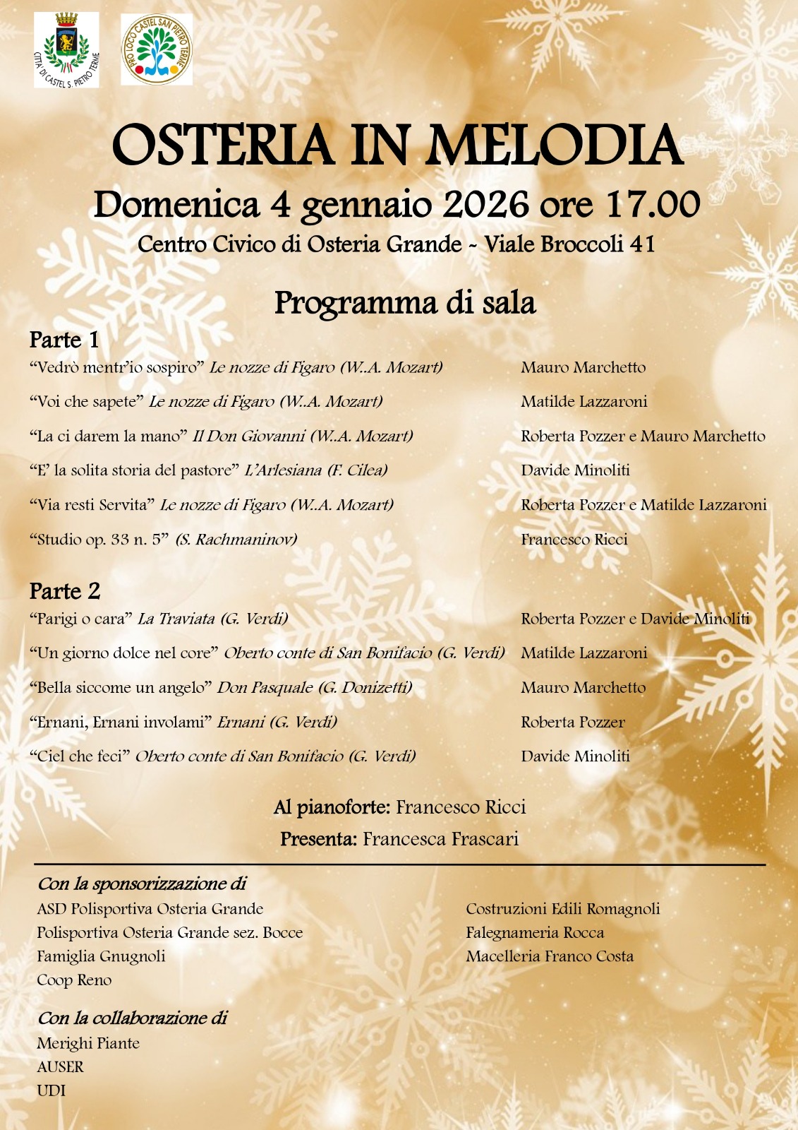 Domenica 4 gennaio 2026, alle ore 17.00, il Centro Civico di Osteria Grande (Viale Broccoli 41) ospiterà Osteria in Melodia, un raffinato pomeriggio musicale dedicato all’opera lirica, promosso dal Comune di Castel San Pietro Terme insieme alla Pro Loco.