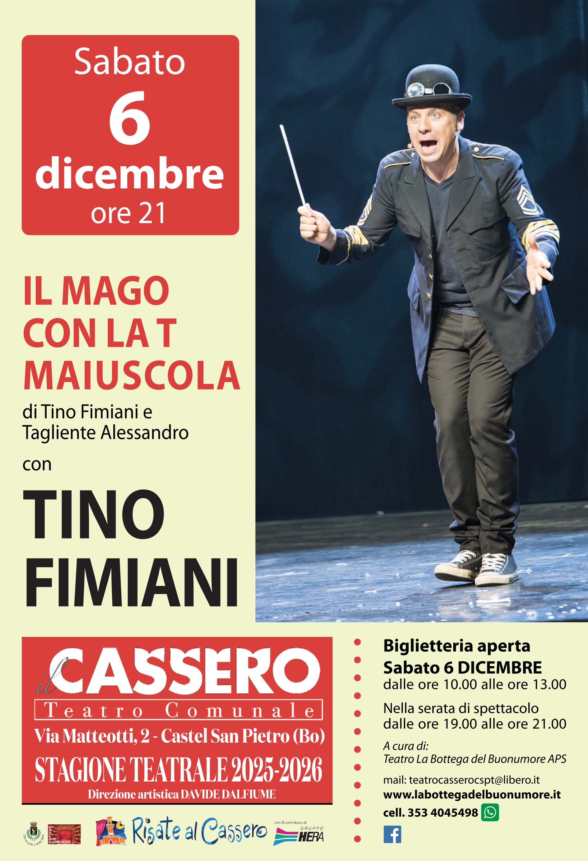 Terzo spettacolo del cartellone del Teatro Comunale Cassero di Castel San Pietro Terme, anticipatore del clima natalizio con illusionismo e magia comica, sarà "Il mago con la T maiuscola" sabato 6 dicembre alle 21. Sulla scena protagonista solista il poliedrico ed eclettico attore clown Tino Fimiani, più pazzo che mai, proporrà nuovi numeri e gag di magia, pickpocket, giocoleria che faranno ridere tutti. Sarà anche l'occasione per qualche buono spunto di riflessione. Si potranno scoprire le nuove frontiere della ventriloquia e spiare i dialoghi tra Tino e il suo analista, che è sempre lui. E poi... no, aspettate! Niente spoiler. Il resto lo scoprirete se verrete a vederlo!